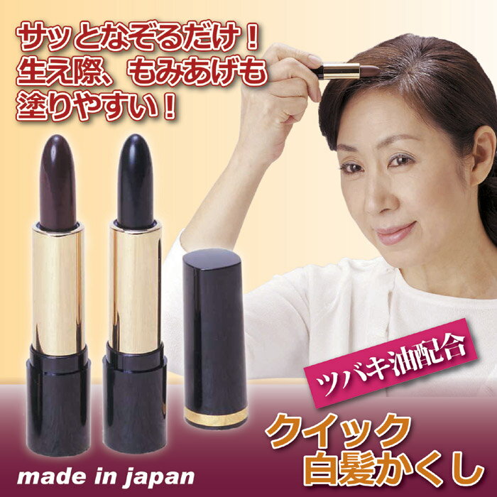 >>店舗トップへはコチラ<< 商品名クイック白髪かくしカラーブラック・ブラウン商品サイズ約 直径2.0×高さ7.5cm 内容量/4g材質リンゴ酸ジイソステアリル、トリイソステアリン酸ポリグリセリル-2、バルミチン酸オクチル、ポリエチレン、キャンデリラオウ、セレシン、マイクロクリスタリンワックス、ツバキ油、キダチアロエエキス-2、スクワラン、トコフェロール、ホホバ種子油、ログウッドエキス、BHT、(+/−)、シリカ、酸化チタン、酸化鉄本体重量17.5g商品説明便利で使いやすい口紅タイプの白髪かくし!●気になる生え際に! ●髪に優しい椿油配合で、出かけ先でもサッとひと塗り! お出かけ前や外出先でサッと塗るだけで白髪を目立たなくします。