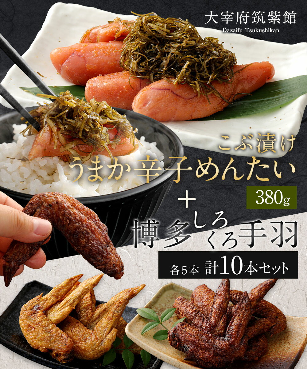 商品説明 名称 大宰府筑紫館の博多こぶ漬けうまか辛子めんたい+博多くろ5本・しろ5本手羽計10本セット 産地 すけとうだら:アメリカ又はロシア、昆布:日本手羽:福岡県産 内容量 【辛子明太子(昆布入り)】380g 【手羽さき】くろ5本、白5本 原材料名 【辛子明太子】すけとうだらの卵巣(アメリカ又はロシア)、昆布(国内産)、食塩、醤油、米醗酵調味料、醸造酢、鰹節エキス、唐辛子/調味料(アミノ酸等)、酒精、酸化防止剤(V.C)、酸味料、ナイアシン、発色剤(亜硝酸Na)、(一部に大豆・小麦を含む) 【博多くろ(黒)手羽】鶏手羽さき(福岡県産)、醤油、大豆油、醸造調味料、水飴、醸造酢/調味料(アミノ酸等)、カラメル色素、甘味料(サッカリンNa、甘草、ステビア)、酸味料、(一部に小麦・大豆・鶏肉を含む) 【博多しろ(白)手羽】鶏手羽さき(福岡県産)、大豆油、食塩、こしょう/調味料(アミノ酸等)、(一部に大豆・鶏肉を含む) 賞味期限 15日 保存方法 冷凍 提供者 食工房 筑紫館 商品説明 国内産羅臼昆布で取っただしをベースにしたタレに大ぶりの明太子を長時間じっくりと漬け込みました。