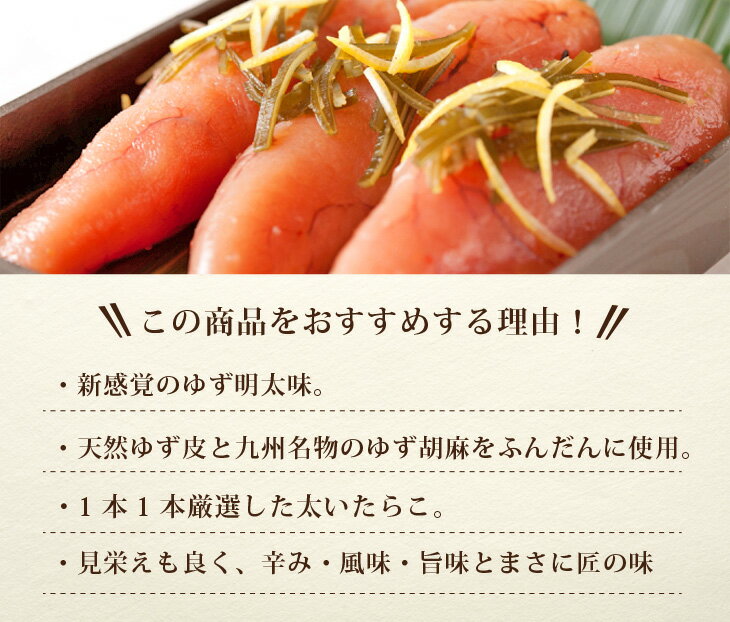 のし・ラッピング対応いたします名称 ゆず辛し明太 300g【ご贈答用】 商品説明 辛みと唐辛子は一切つかわず、フレッシュな天然のゆずの皮と、 九州名物のゆず胡麻をふんだんに使用。